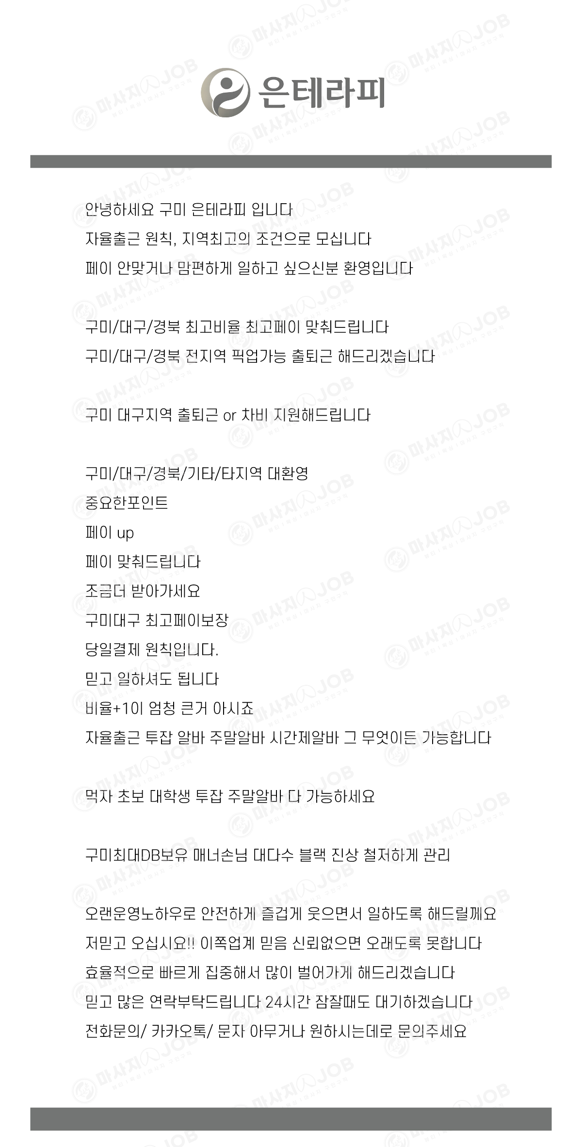- 마사지인잡의 동의없이 재배포 할 수 없으며 상기 채용정보는 구직목적으로만 이용 할 수 있습니다.