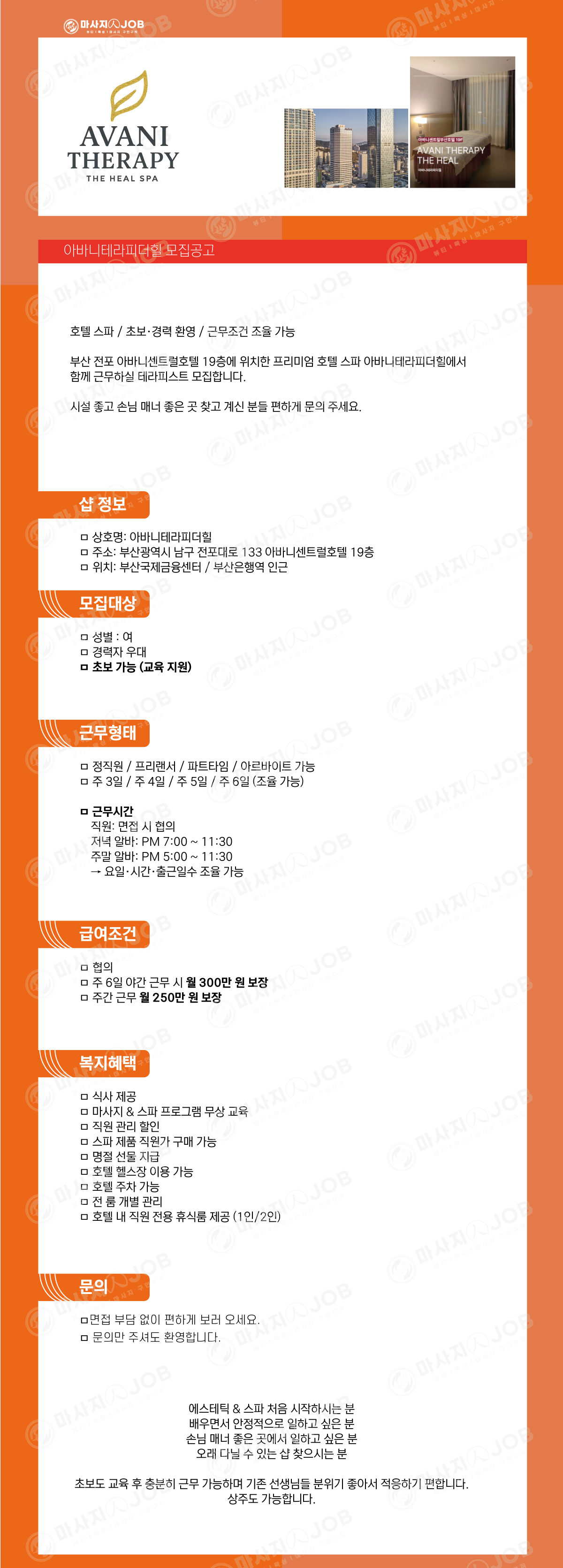 [아바니테라피더힐] 부산/아바니센트럴호텔 프리랜서/정직원 모집